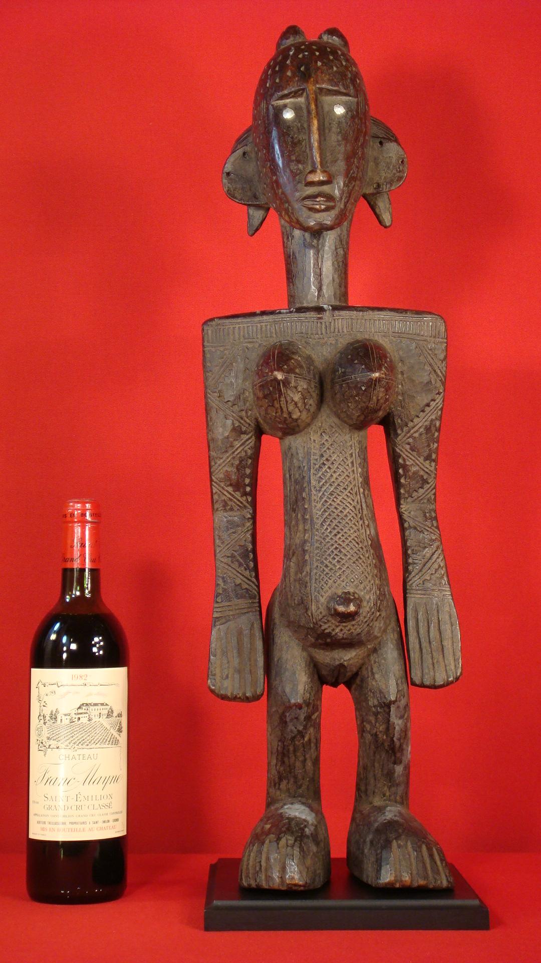 Grande statue Bambara du Mali - XIXème Titre de l'objet : Grande statue Bambara du Mali - XIXème Description : Grande statue de l'ethnie Bambara du Mali - datant de la fin XIXème - pièce importante pour collectionneur - hauteur : 64 cm - belle coiffe, seins proéminents - bois assez bon état, un peu fossilisé, avec des imperfections et fentes dues à l'âge - poids : 4,5 Kg - livrée avec son socle bois - Durant la période pré-électorale, investissez dans des produits culturels issus des collections du Musée d'Art primitifs de Cannes. Prix : 2.600 € - Réf annonce n° 346 Pour commander, cliquez ici